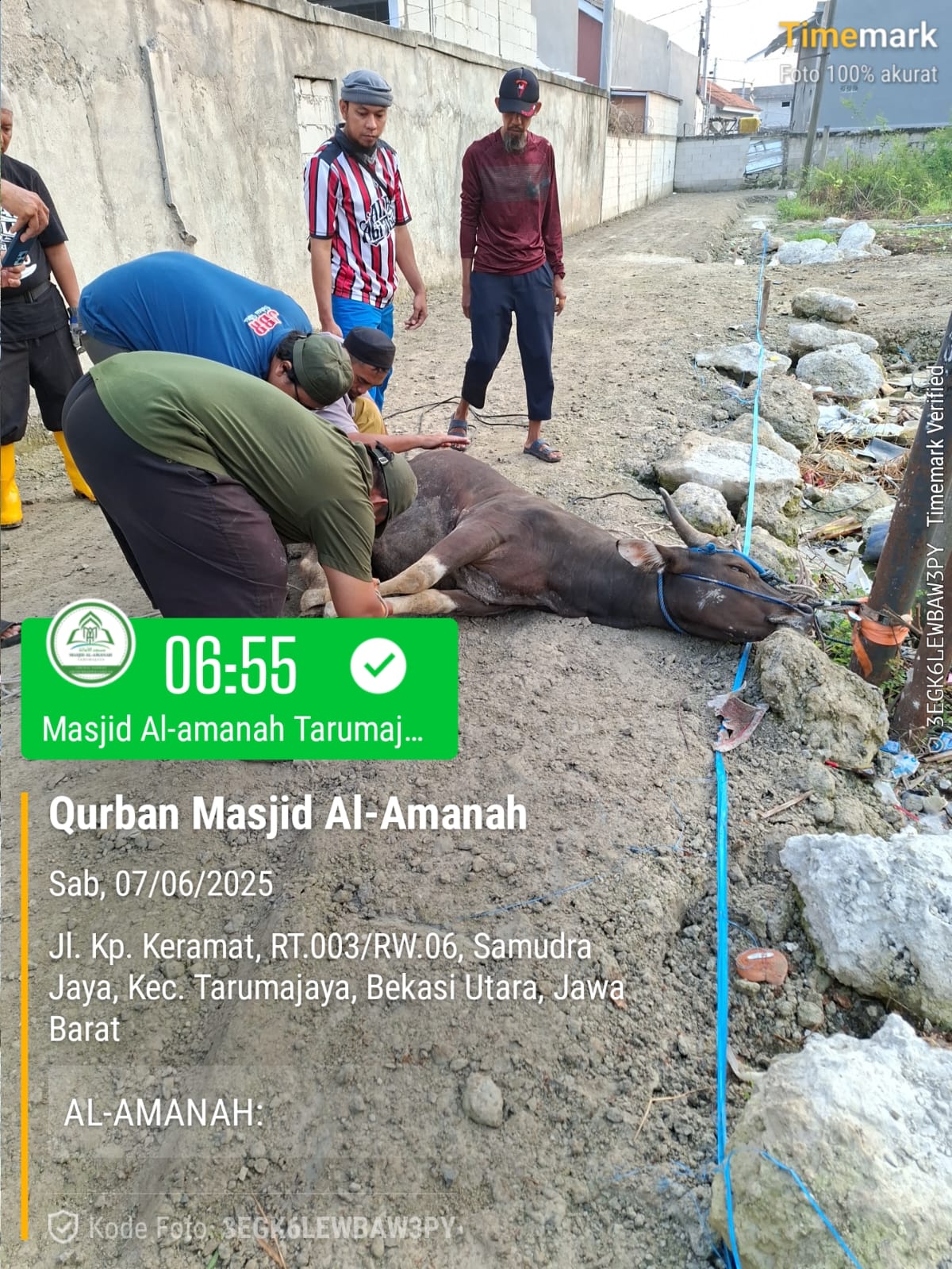 Momen kerja sama panitia dan warga dalam menangani hewan kurban sesuai syariat.